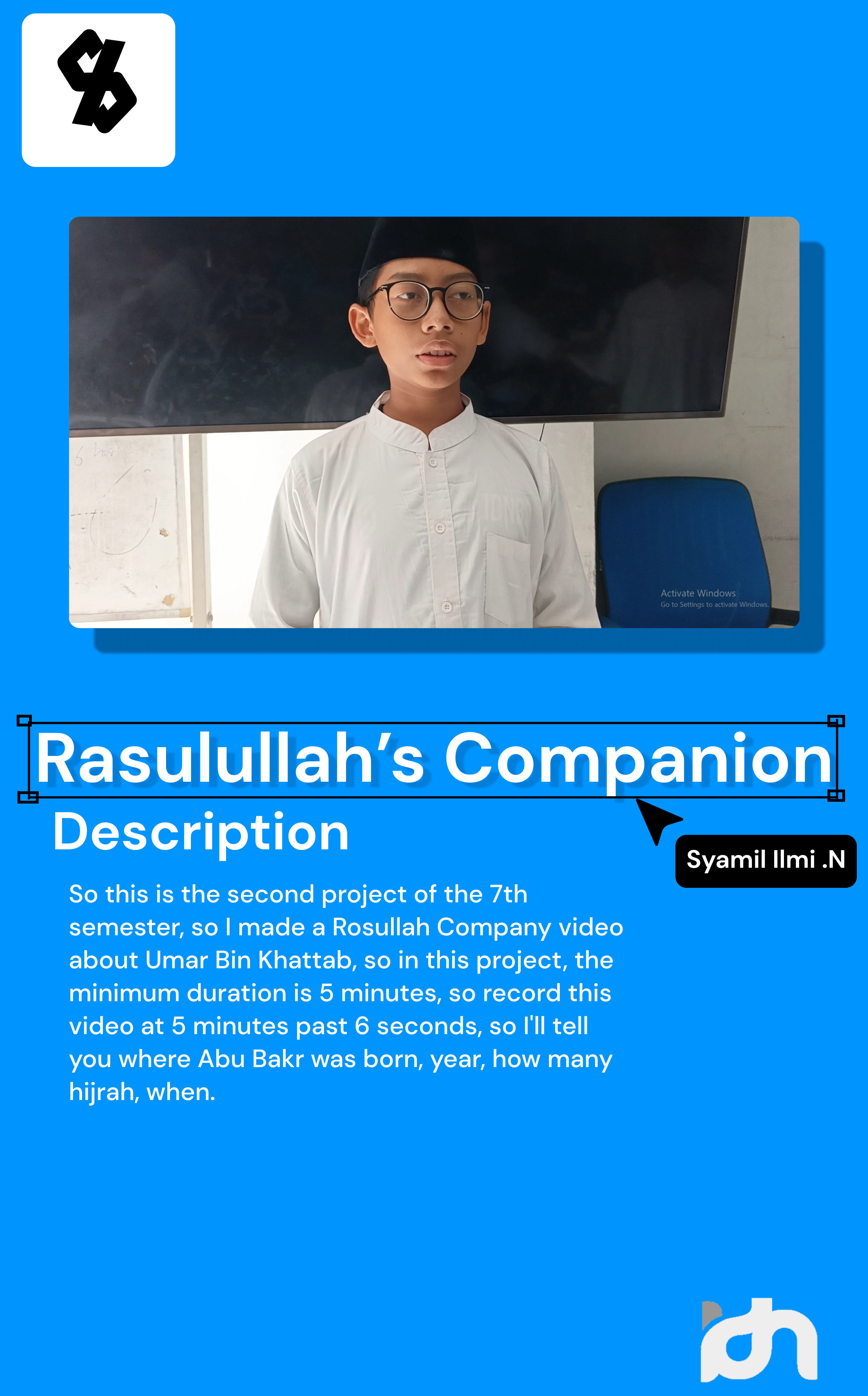 So this is the second project of the 7th semester, so I made a Rosullah Company video about Umar Bin Khattab, so in this project, the minimum duration is 5 minutes, so record this video at 5 minutes past 6 seconds, so I’ll tell you where Abu Umar Bin Khatab born, year, how many hijrah, when.