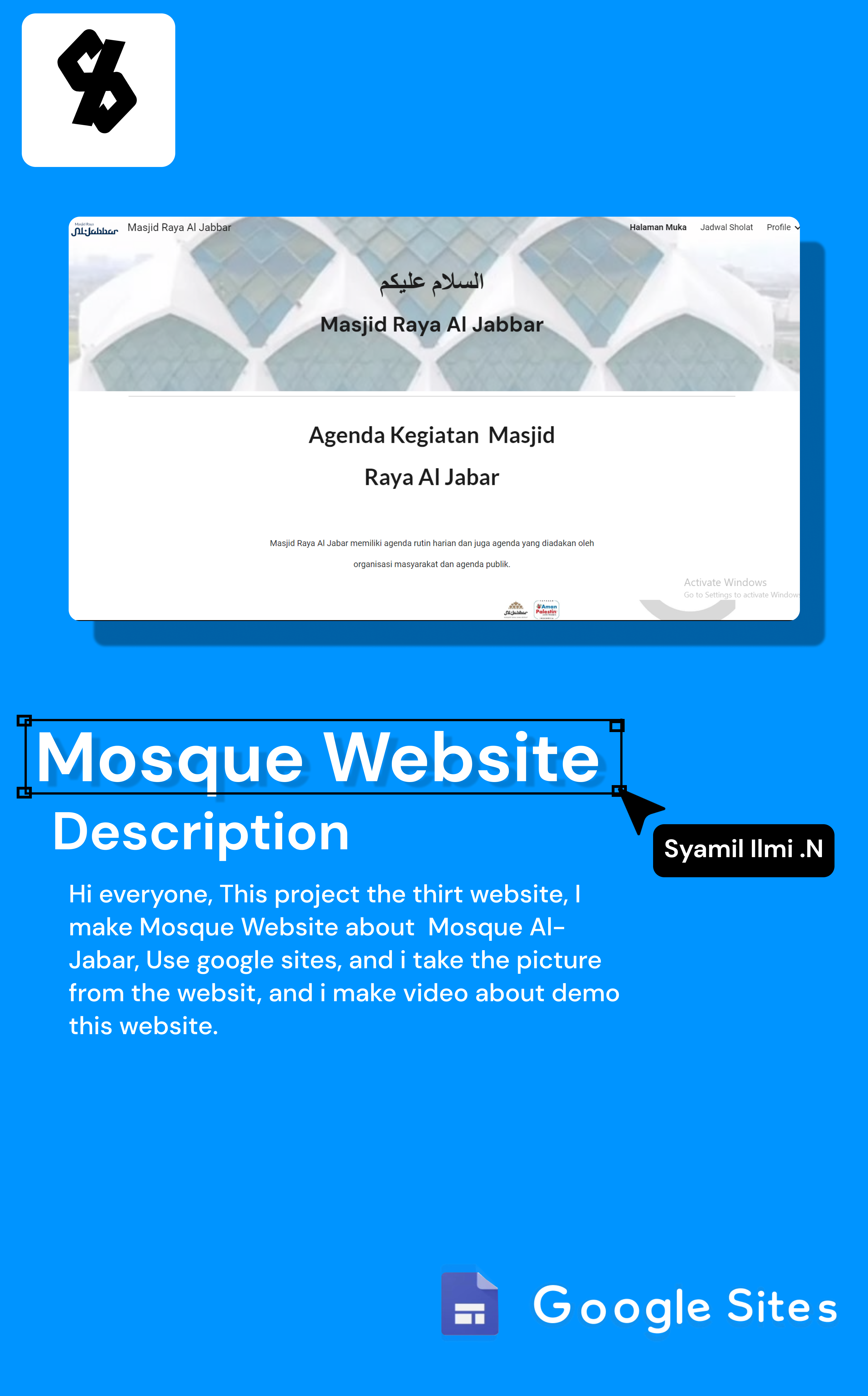Hi everyone, This project the thirt website, I make Mosque Website about Mosque Al- Jabar, Use google sites, and i take the picture from the websit, and i make video about demo this website.
