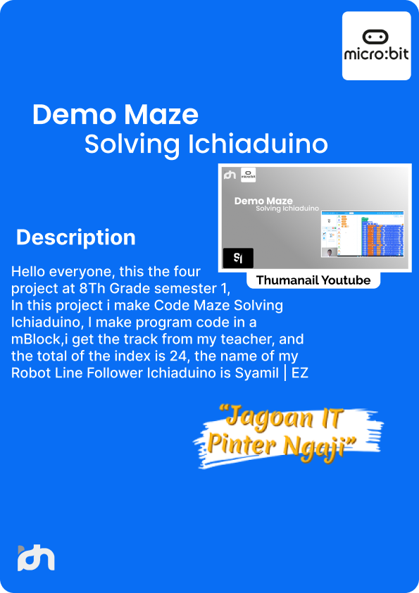 Hello everyone, this the four project at 8Th Grade semester 1, In this project i make Code Maze Solving Ichiaduino, I make program code in a mBlock,i get the track from my teacher, and the total of the index is 24, the name of my Robot Line Follower Ichiaduino is Syamil | EZ