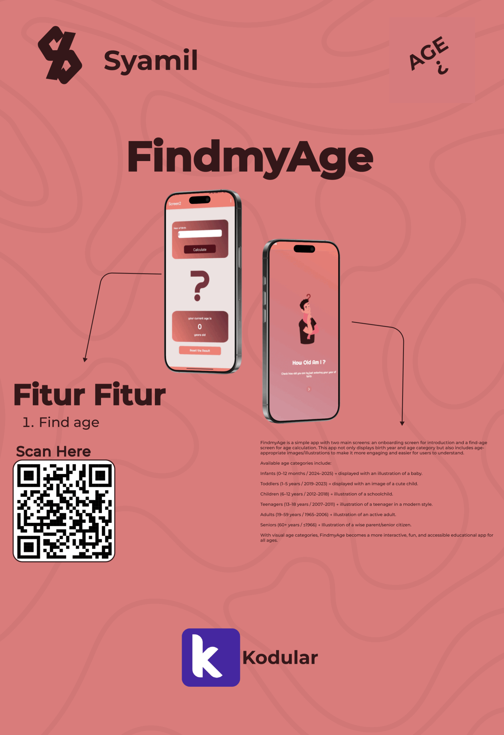 FindmyAge is a simple app with two main screens: an onboarding screen for introduction and a find-age screen for age calculation. This app not only displays birth year and age category but also includes age-appropriate images/illustrations to make it more engaging and easier for users to understand.