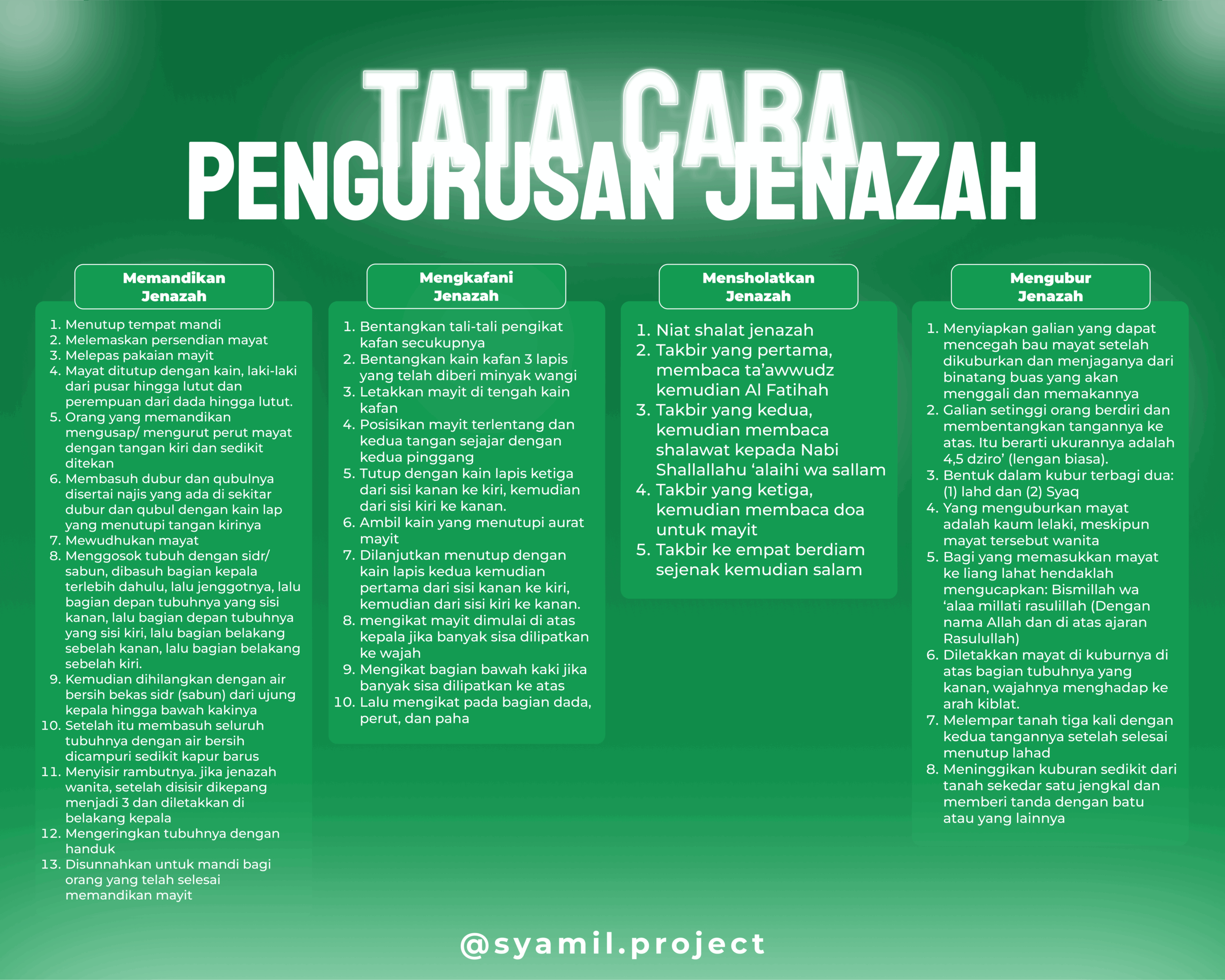 Praying over the Corpse – starting with the intention, followed by four takbirs, reciting Al-Fatihah, salawat (prayer) on the Prophet, a prayer for the deceased, and concluding with a greeting.