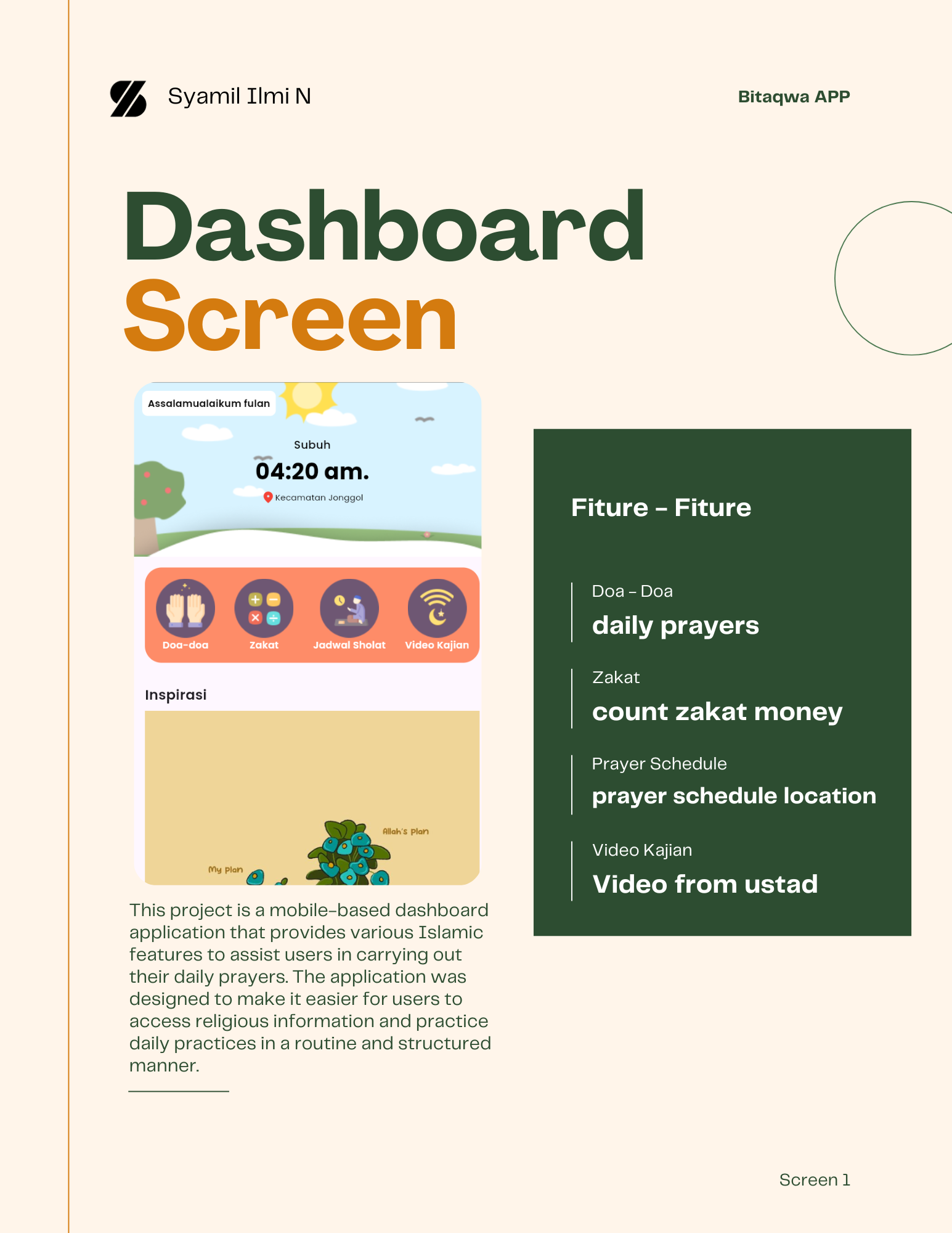 This project is a mobile-based dashboard application that provides various Islamic features to assist users in carrying out their daily prayers. The application was designed to make it easier for users to access religious information and practice daily practices in a routine and structured manner.