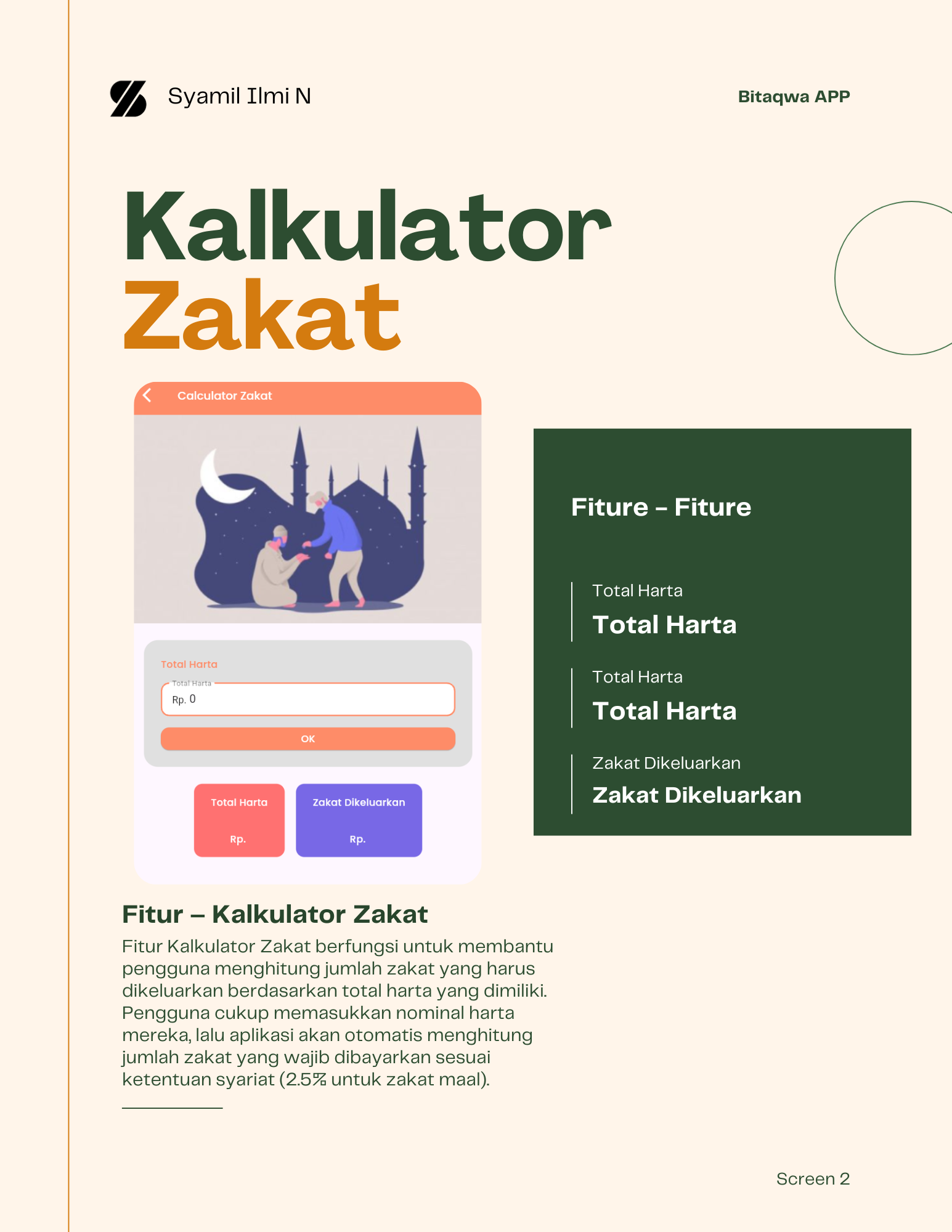 Fitur Kalkulator Zakat berfungsi untuk membantu pengguna menghitung jumlah zakat yang harus dikeluarkan berdasarkan total harta yang dimiliki. Pengguna cukup memasukkan nominal harta mereka, lalu aplikasi akan otomatis menghitung jumlah zakat yang wajib dibayarkan sesuai ketentuan syariat (2.5% untuk zakat maal).