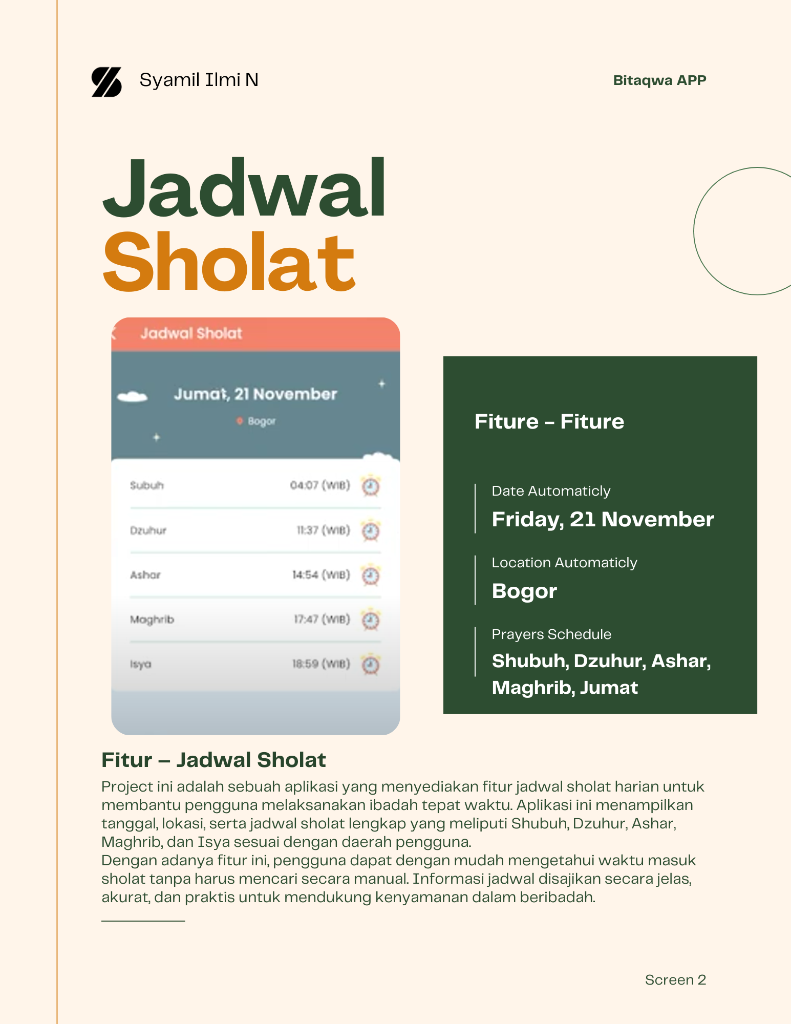 Project ini adalah sebuah aplikasi yang menyediakan fitur jadwal sholat harian untuk membantu pengguna melaksanakan ibadah tepat waktu. Aplikasi ini menampilkan tanggal, lokasi, serta jadwal sholat lengkap yang meliputi Shubuh, Dzuhur, Ashar, Maghrib, dan Isya sesuai dengan daerah pengguna.